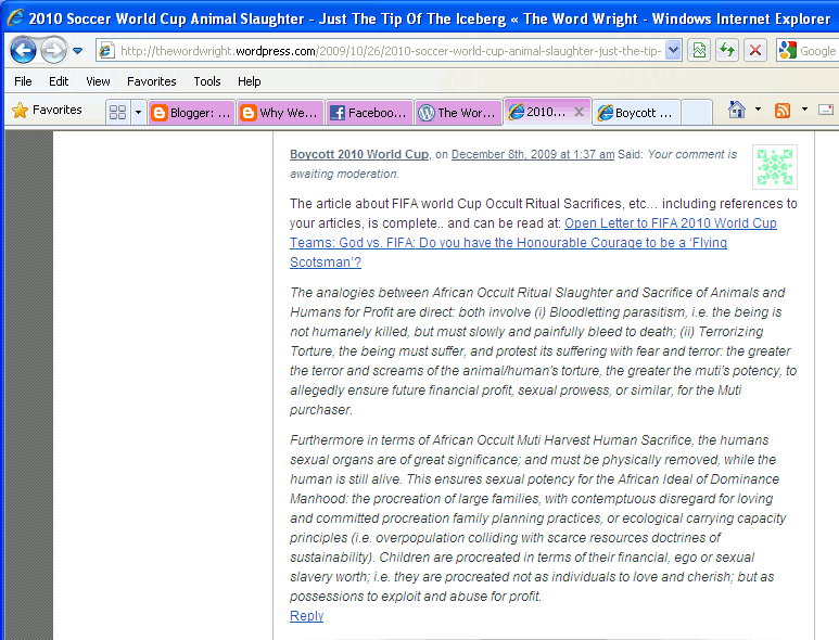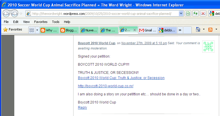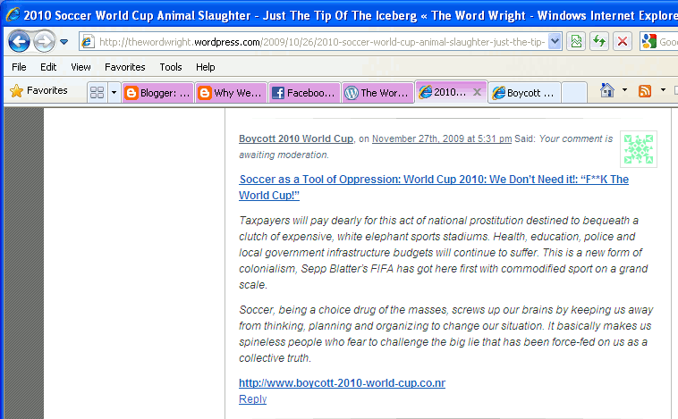 See: Screenshots of Ms. Bouwer/Word Wrights Censoring Boycott 2010 World Cup Comments: